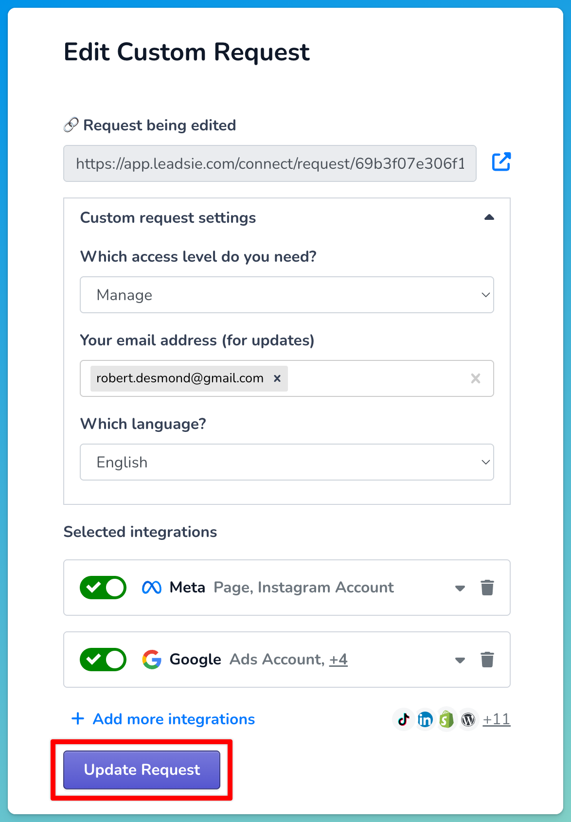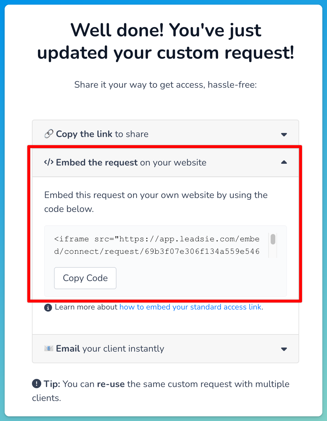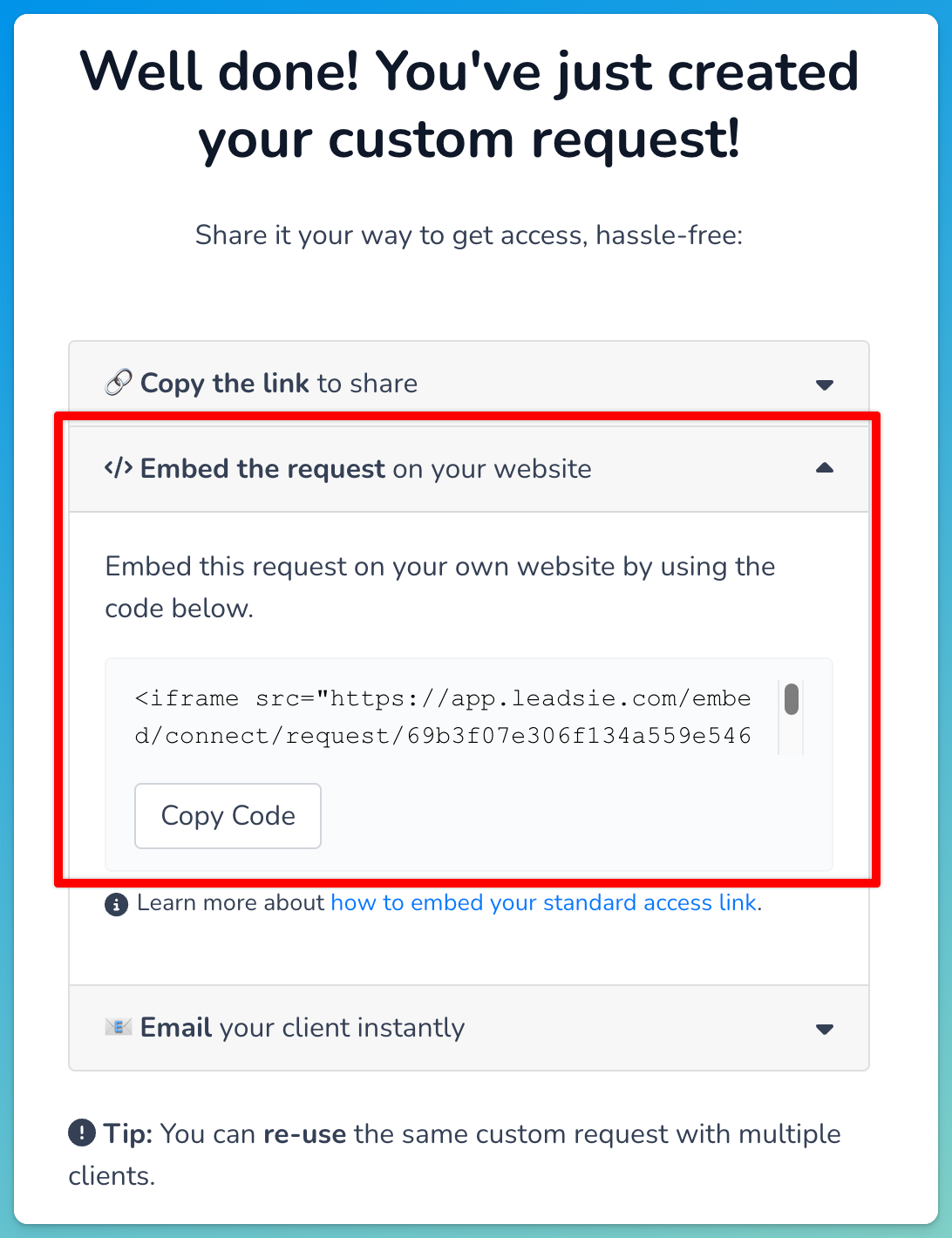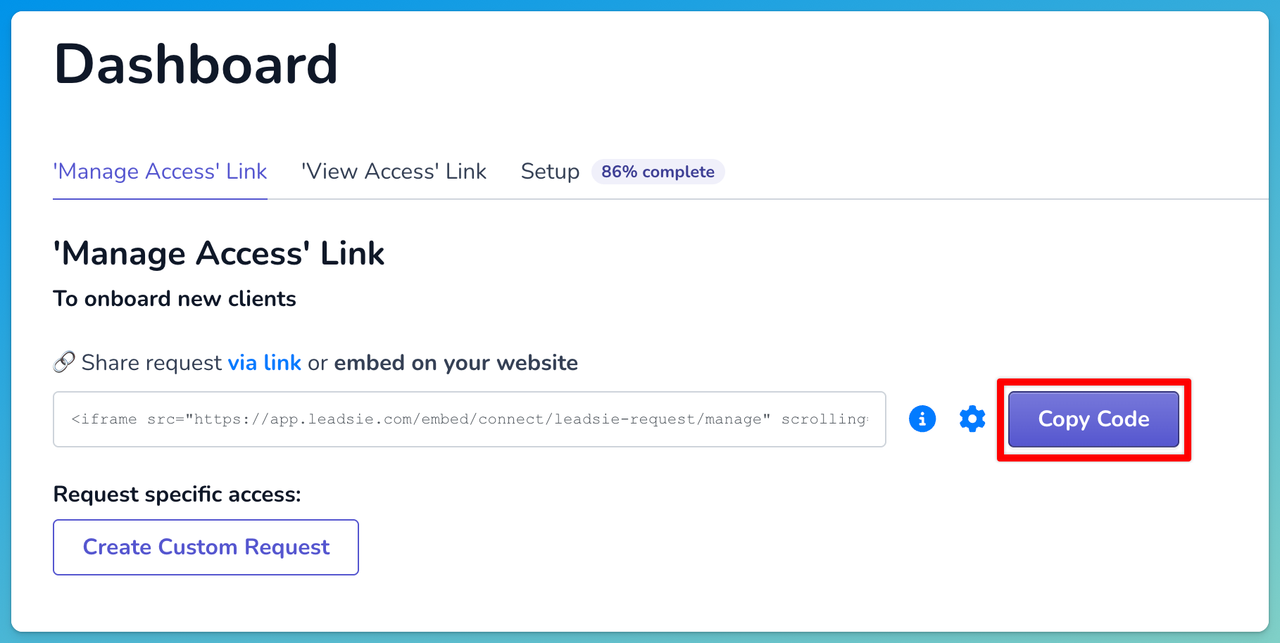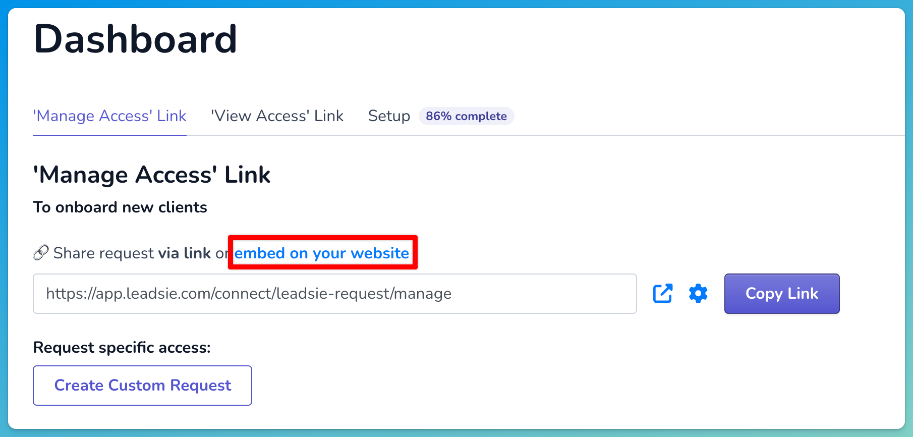 1 - Make sure you are logged in to Leadsie, then go to your request link, e.g. the "manage link" on your dashboard and click "embed on your website"