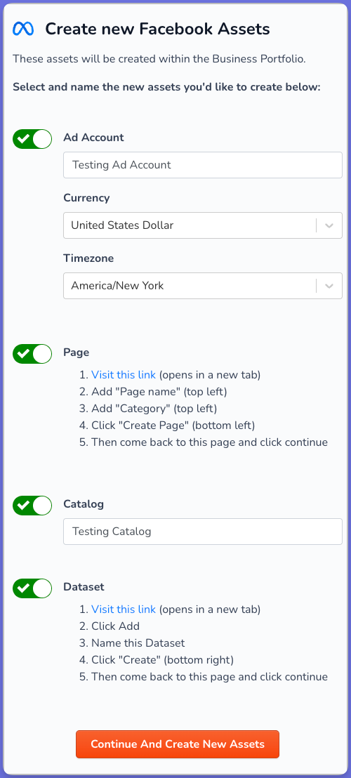 5 - Select which assets to create within that business manager
